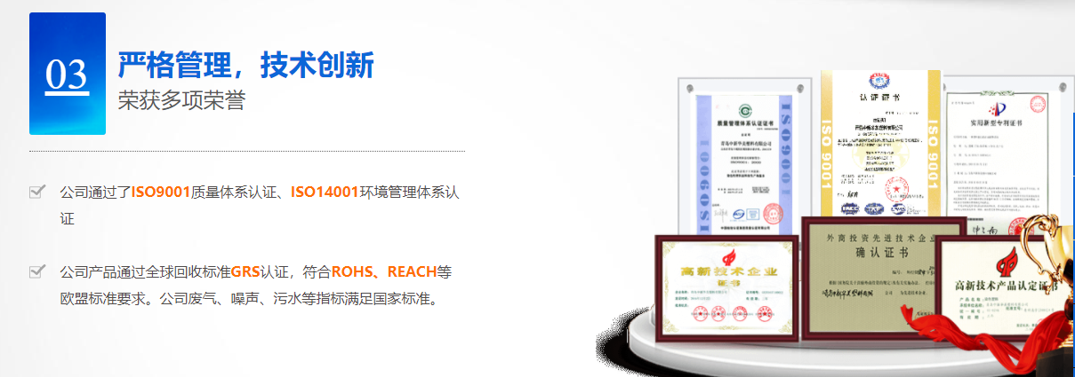 河南污污免费网站新材料科技有限公司已通過ISO9001質量體係、14001環境體係、45001職業健康安全管理體係認(rèn)證;GRS全球回收標準認證;美國UL OBP 2809趨海(hǎi)塑料認證;BSCI商業社會標準認證;LCA生命周期(qī)認證。